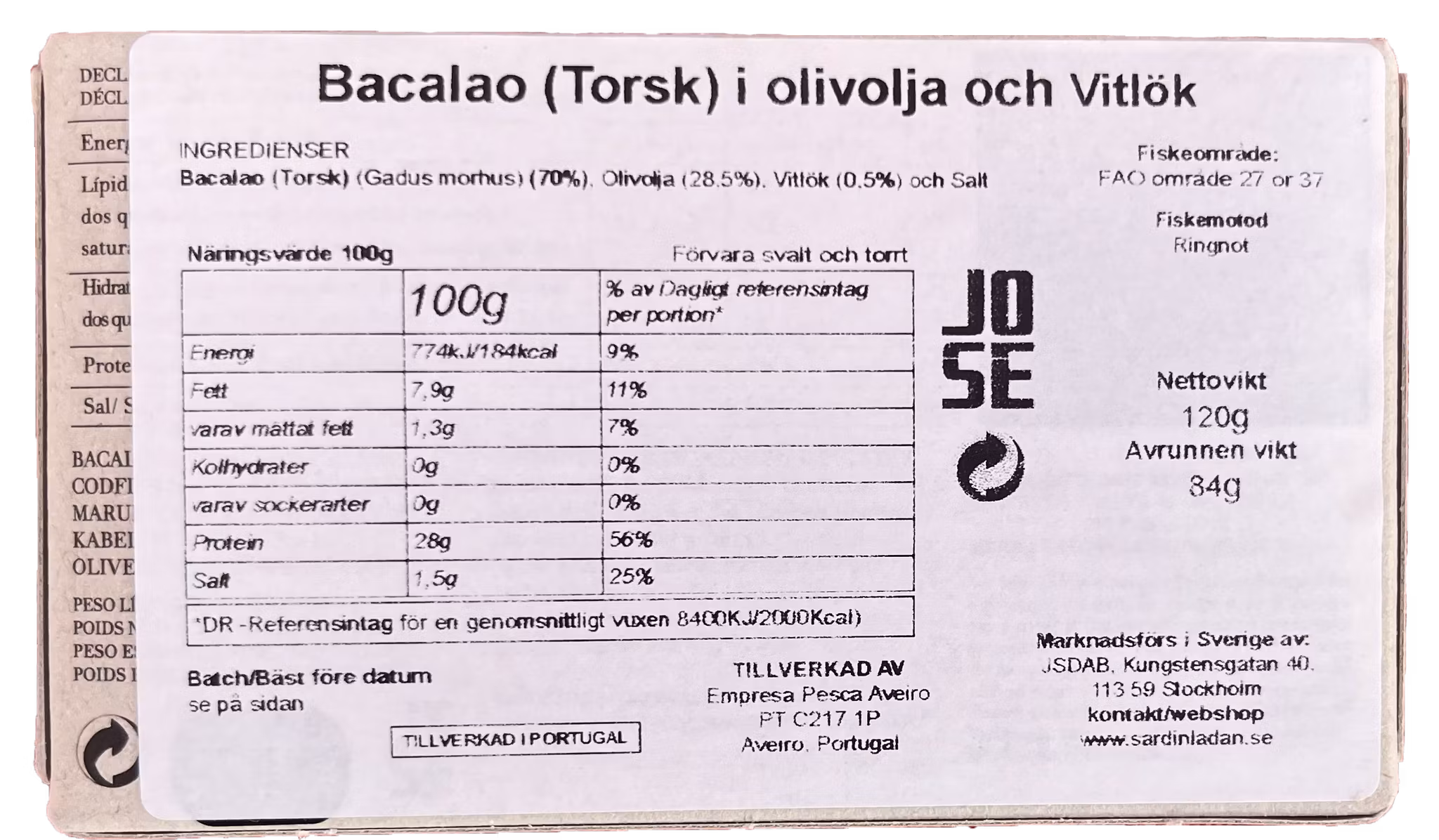 Nettovikt 120g/avrunnen vikt 84g. Tillverkad i Portugal