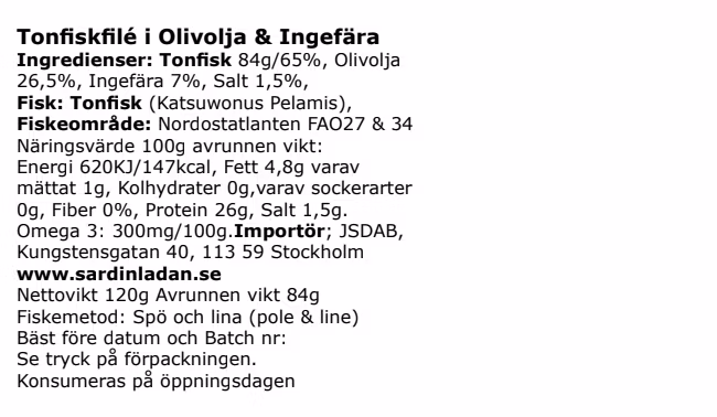 Tonfiskfiléer inlagda i den finaste olivoljan och färsk ingefära. Mild kombo som för tankarna till en japansk sushi. Spöfångad från Azorerna.